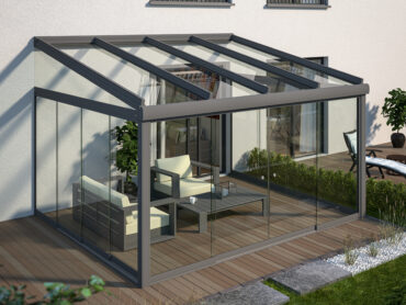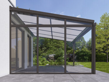 Wind- und Wetterschutz für Murano Glasdächer, Breite bis 580cm (seitenöffnend) und bis 1150cm (mittigöffnend), Höhe bis 230cm mit 8mm ESG Verglasung und bis 260cm mit 10mm ESG Verglasung, Gestellfarbe aus 29 Standardfarben oder Sonderlacke