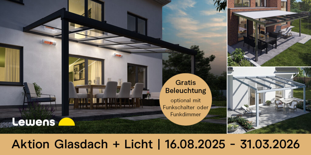 Genießen Sie entspannte Stunden im Freien – ob tagsüber im Schatten oder abends mit stimmungsvoller Gratisbeleuchtung unter Ihrem Glasdach von Lewens. In der Zeit vom 16. August 2025 bis zum 31. März 2026 erhalten Sie beim Kauf eines unserer Glasdach-Modelle ein attraktives Aktionspaket: