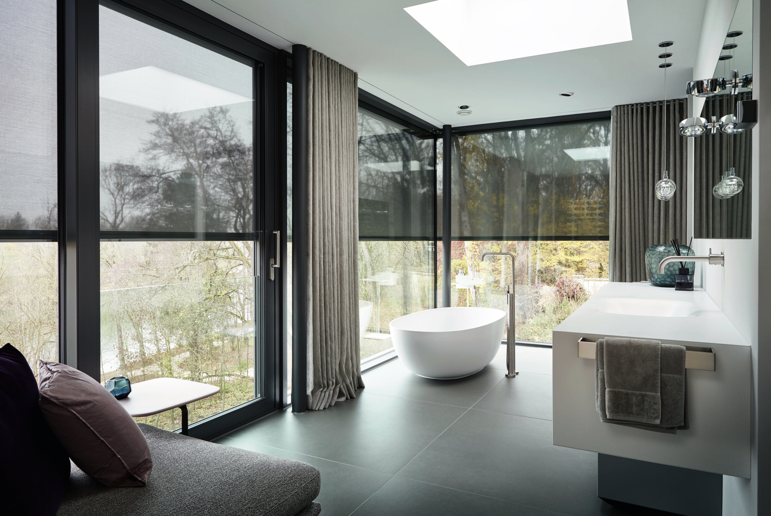 Auch die Textilscreens von ROMA reagieren auf Knopfdruck. Sie sind einfach zu programmieren und können einzelne Elemente, Gruppen oder zentral alle Textilscreens im Haus bewegen. Ganz ohne mechanische Bedienelemente. Elegante und intuitiv zu bedienende Wandtaster machen die Bedienung der Textilscreens einfach und komfortabel. Die ROMA Funksteuerung liegt gut in der Hand und übernimmt die Steuerung von Licht und Sicht.